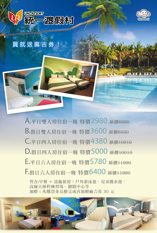 只要2980元起,即可享有【統一渡假村-墾丁海洋體驗樂園】雙人/四人/六人住宿方案!買就送麻吉券!〈A.平日雙人房 / B.假日雙人房 / C.平日四人房 / D.假日四人房 / E.平日六人房 / F.假日六人房 住宿一晚 + 早餐 + 設施使用:戶外游泳池、兒童戲水池、高爾夫揮桿練習場、網路中心等〉加贈:凡購買並兌換完成再加贈麻吉券 30 元